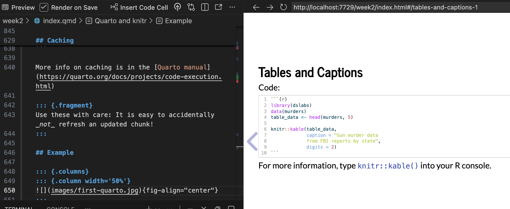 ```{r}library(dslabs)data(murders)table_data <-head(murders, 5)knitr::kable(table_data, caption ="Gun murder data from FBI reports by state",digits =2)```
