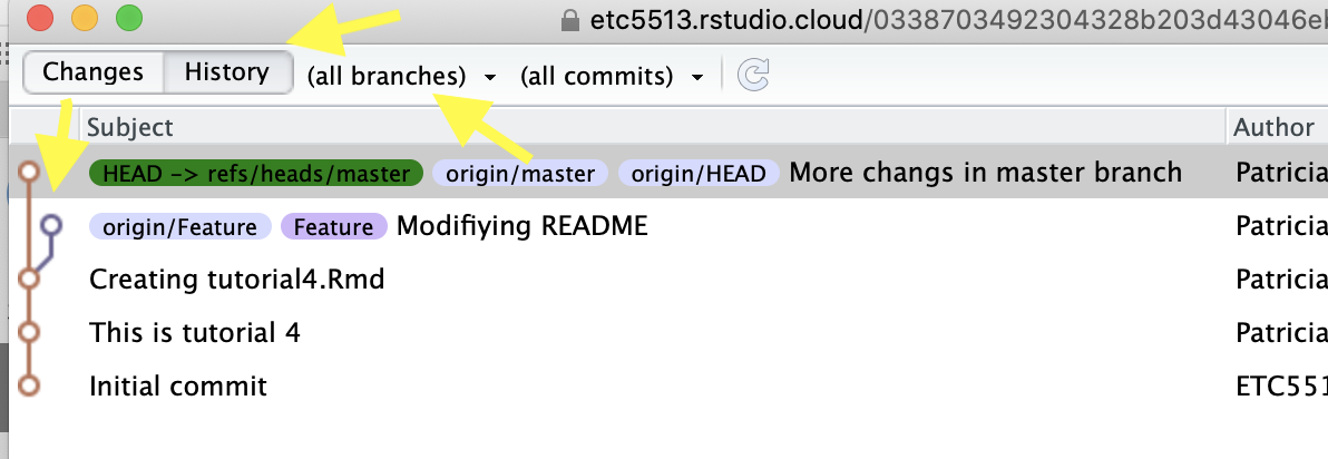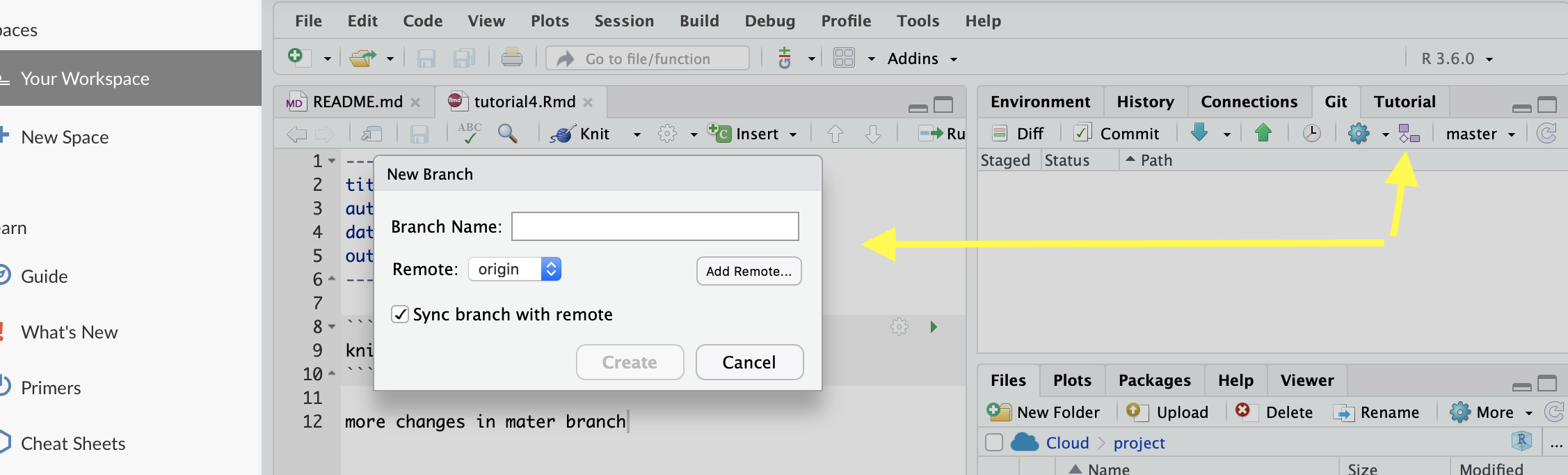 When we create a branch using Rstudio the branch is created both in the local and in the remote repository (at the same time.)