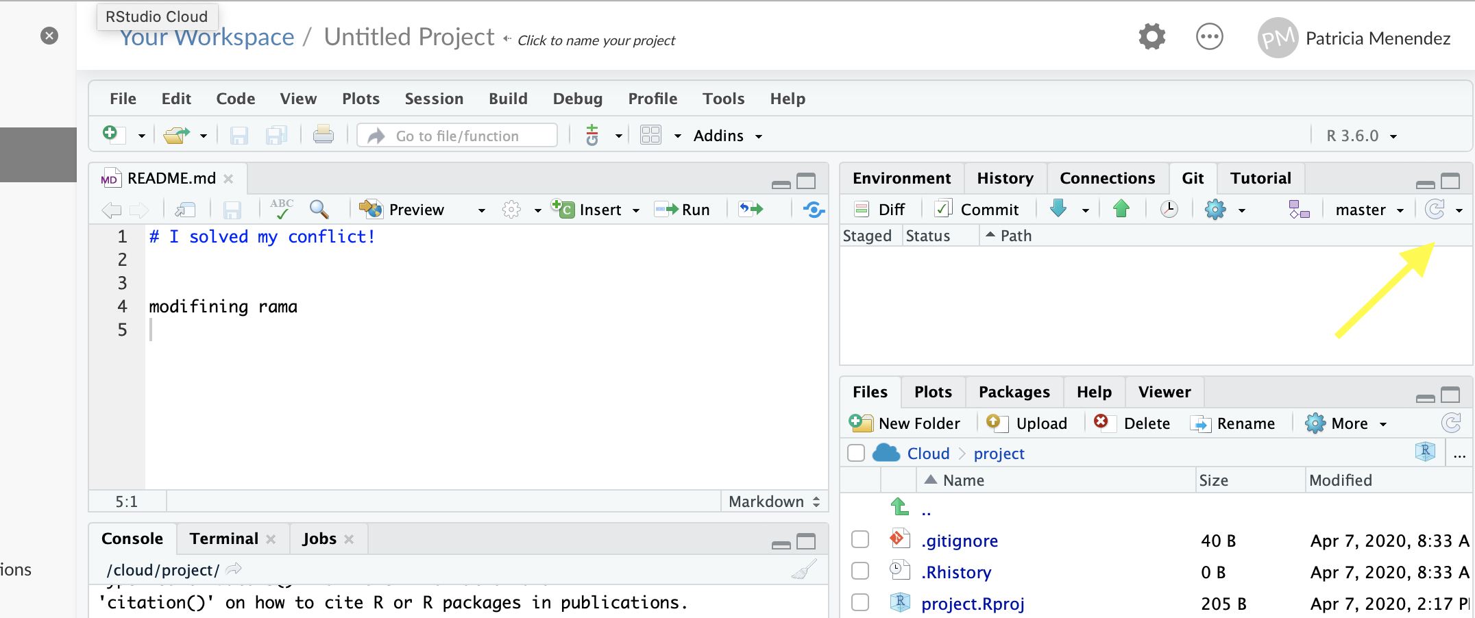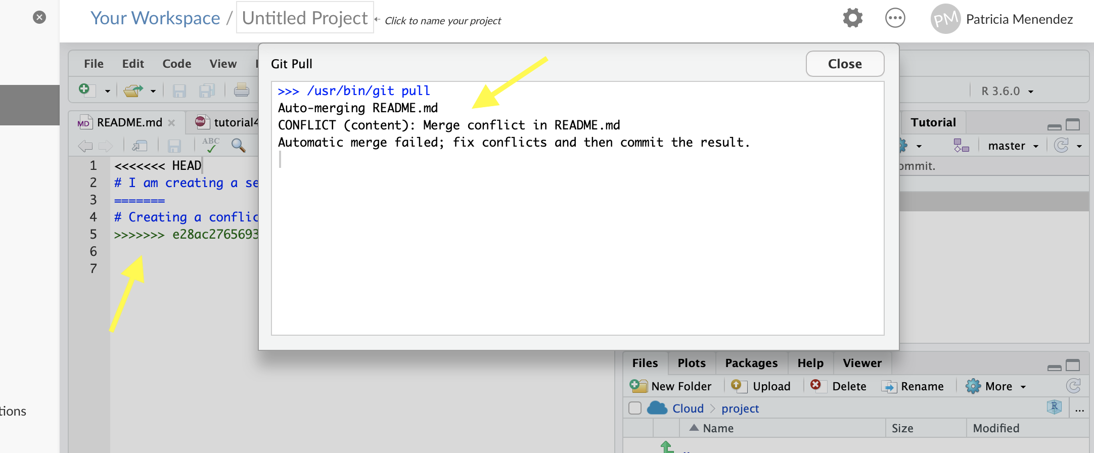 git add filenamegit commit -m "Message"git push origin mainWhen you open the conflict file in a text editor such as Rstudio, you will see the conflicted part marked like this: