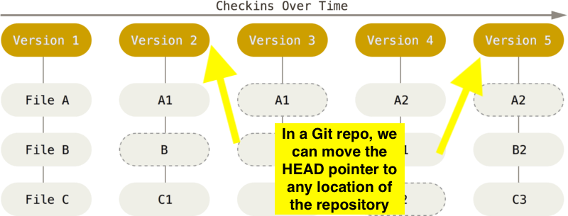 HEAD is a pointer that Git uses to reference the current snapshot that we are looking at.