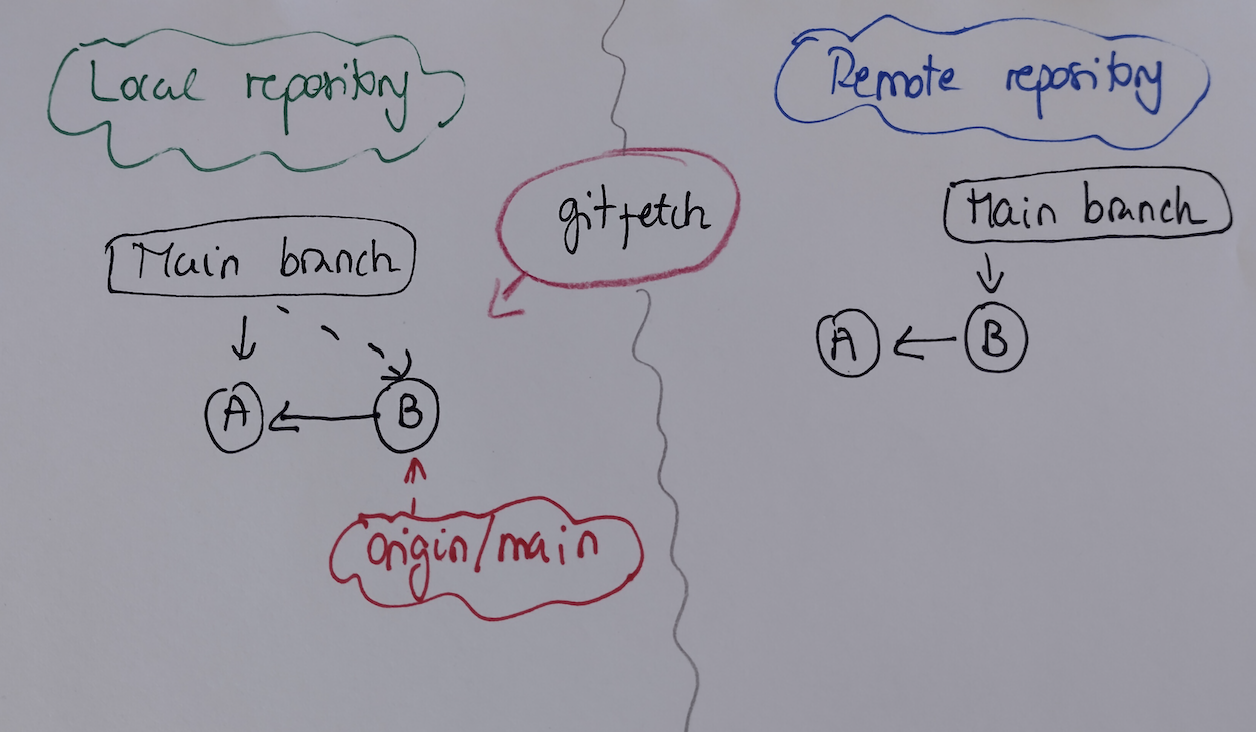 git fetch downloaded the new B commit however our local working directory is not updated, and the head of our main branch is still pointing to commit A.