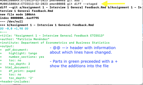 git log -n 3: show last 3 commitsgit log --since=01-01-2020: Show commits since…git log --until=01-01-2020: Show commits until…git log --author="Michael Lydeamore": Show commits by a single author.git log -p: shows the difference in each commit. You can chain flags, so git log -p -n 2 will limit to the most recent 2 commitsgit log index.qmd will show you all commits on a particular filegit log --oneline -p index.qmd: Shows you all the changes done in the different commits to this file, and their changesgit show will show various information about the repo.git log --stat to see some (abbreivated) stats, like which files were modified, how many files, and how many lines were added or removedgit log --pretty=oneline prints each commit on one linegit log --pretty=format: "%h -%an : %s": Display each commit in one line and display how long ago it wasgit log --pretty=format:"%h %s" --graph: Will also show the treeFor more info on git log, please look here.